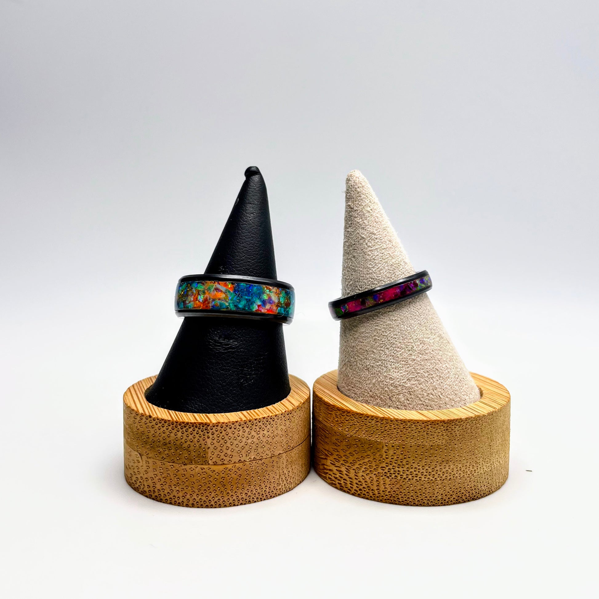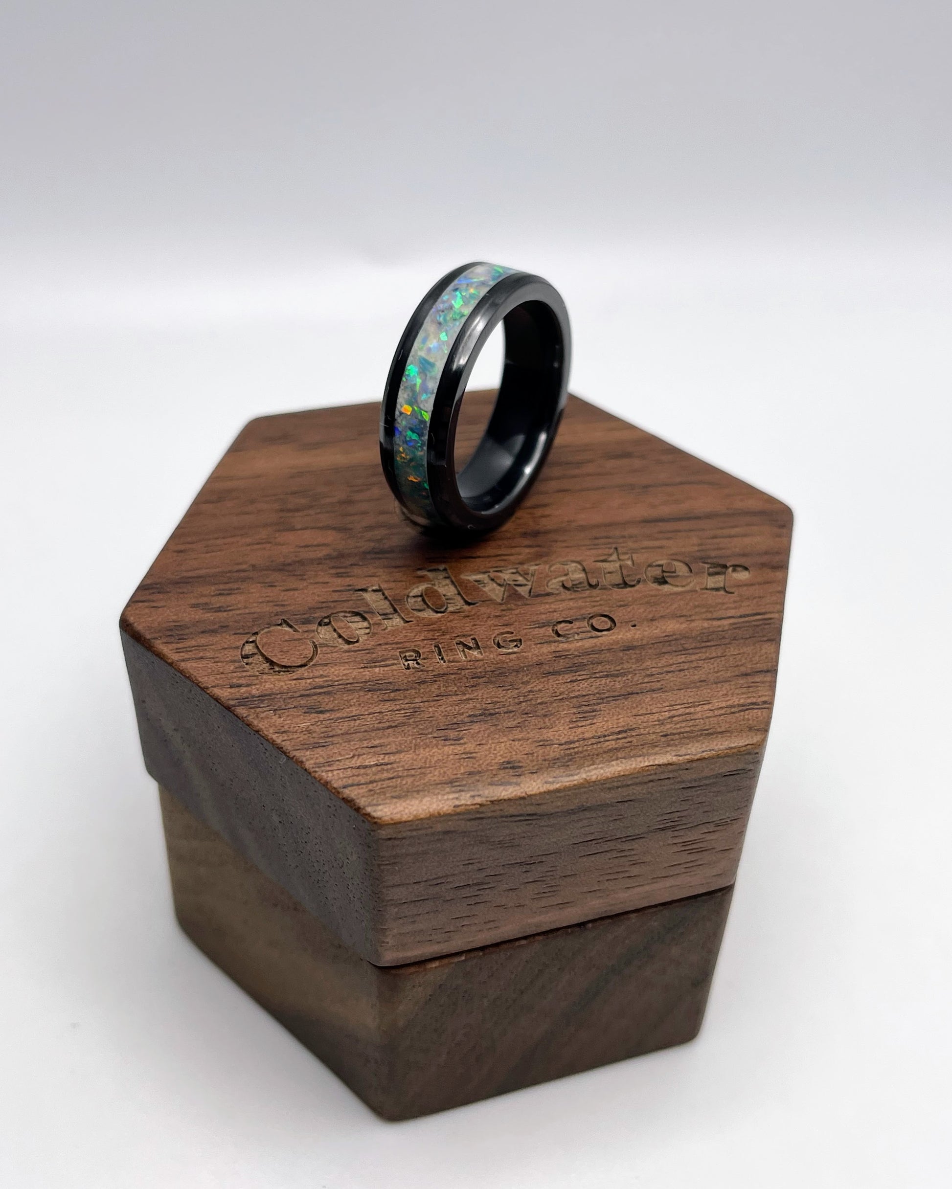 Crafted from durable and lightweight black ceramic, this ring offers both resilience and comfort. The band features a tapered interior, ensuring a snug fit. Personalize your ring further by selecting from a range of stunning opal colors and other customizable aesthetics. With half sizes and customizable widths available, you can create a ring that fits you perfectly.
